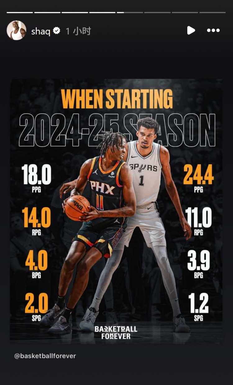 奥尼尔转发:本赛季首发时波尔场均14板4帽2断 均高于文班亚马