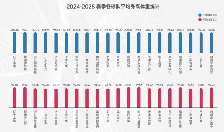 本赛季各队身高体重榜:辽宁最高大 疆浙粤紧随其后 四川最矮小