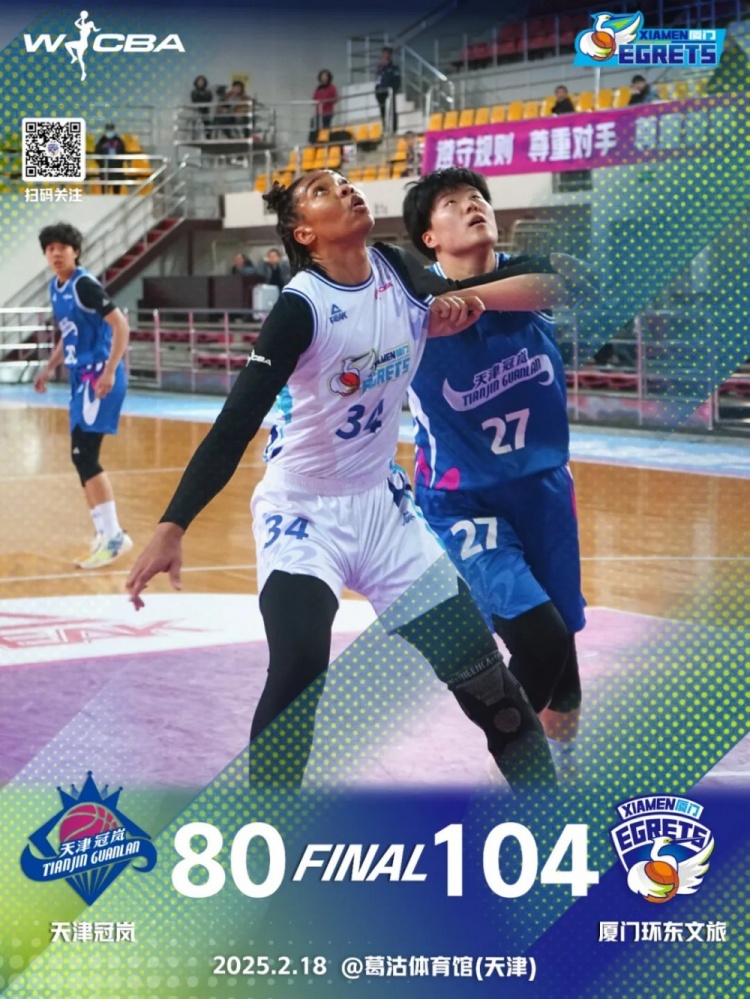 末节决战,肖婉钰三分果断命中,马丁中投再进,厦门环东文旅顺势拉开30分以上领先。随后双方都换上替补年轻球员练兵,天津女篮轰出9-0小高潮追分,廖丽华突破上篮止血回应,分差始终保持在20分以上,最终厦门环东文旅104-80大胜天津冠岚,这也是球队队史单场比赛最高得分。