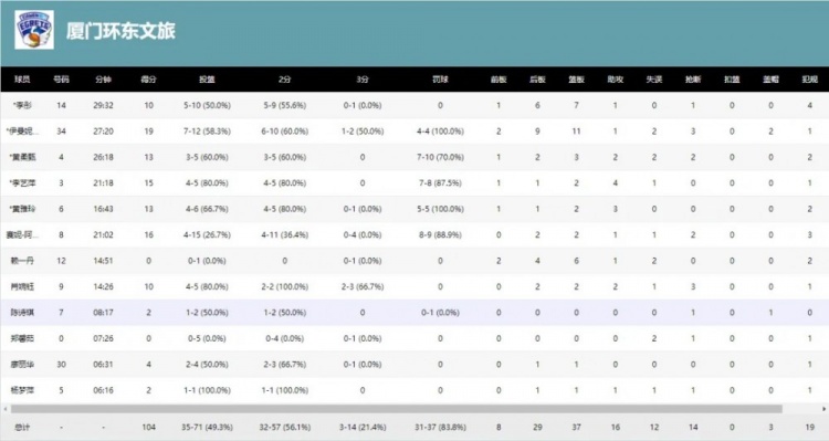但与此同时,厦门女篮进攻持续性依然保持不错,四节得分皆20+;全场保持进攻侵略性,半场就得到28次罚球,而对手仅12次;次节防守端发力同时自己砍下30分反超比分;第三节仅让对手拿到8分,并直接拉开27分领先,最终轻松获胜。厦门女篮全场仅12次失误远远低于对手的22次。整场比赛,厦门环东文旅7人得分上双。国内球员发挥依然亮眼,李艺萍突破加造杀伤效率奇高,全场拿到17分;李彤、黄柔甄、黄雅玲和肖婉钰也都得分上双。内线强点伊曼妮轻松砍下19分11篮板;马丁也是杀伤力十足拿到16分。球队首次常规时间得分破百,客场双杀天津,圆满结束本赛季。希望厦门女篮下赛季再接再厉,争取更好的成绩!