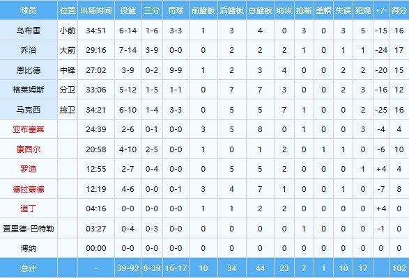 本场比赛乔治拿到球队最高17分,马克西和乌布雷拿到16分,恩比德拿到15分,格莱姆斯12分,康西尔10分。
