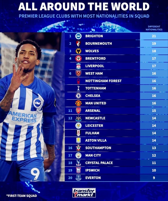 上赛季,布莱顿一线队的球员来自21个国家。