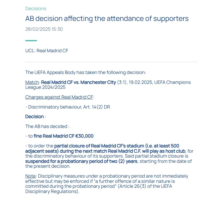 3月1日讯 欧足联上诉委员会于2月28日宣布,对皇马主场伯纳乌球场做出关闭部分看台的处罚,缓刑2年。该处罚源于球迷在欧冠对阵曼城比赛中的歧视行为,若两年内再次违规,将实施至少500个相邻座位的看台区域关闭处罚。
