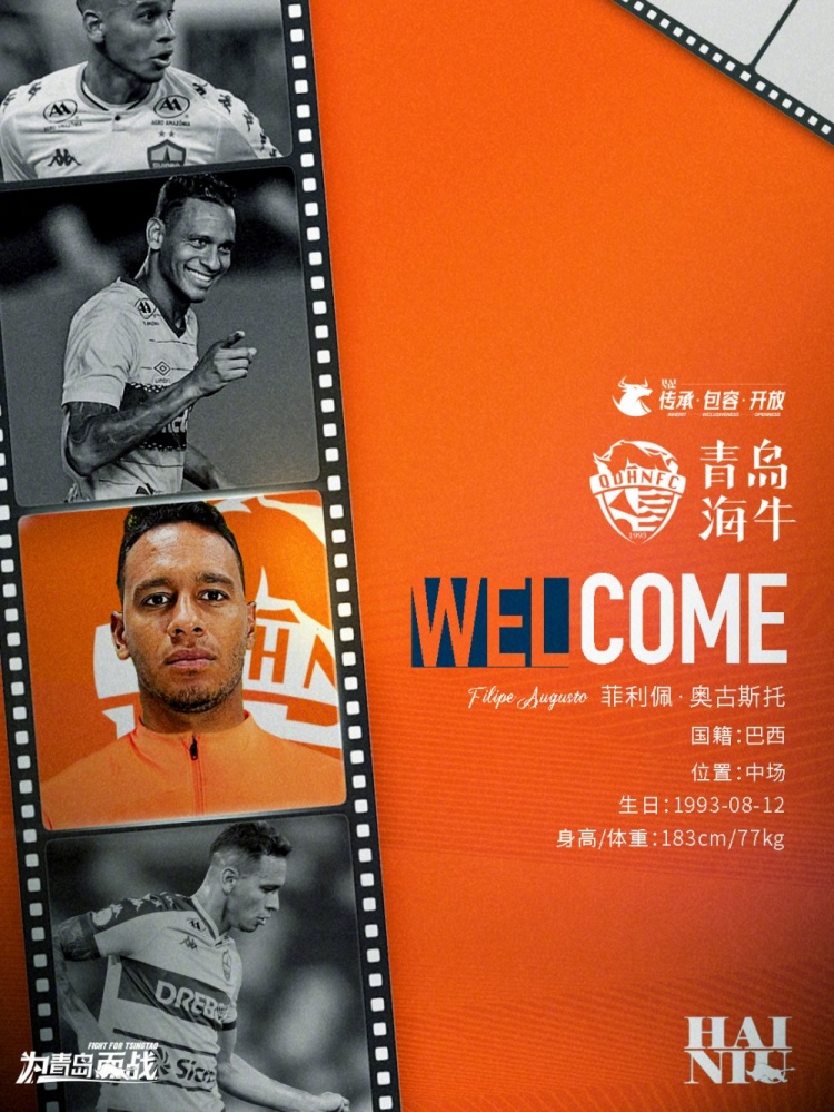 经友好协商并达成一致,自即日起菲利佩·奥古斯托(Filipe Augusto)自由身加盟青岛海牛足球俱乐部。菲利佩·奥古斯托与俱乐部签署1+1合同,欢迎他的到来。
