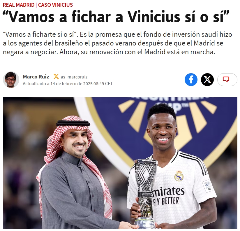 02月14日讯 维尼修斯与沙特联赛的转会传闻愈演愈烈,《阿斯》透露了新的消息。