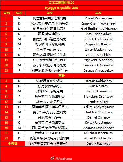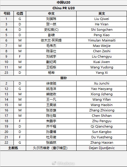 U20国足首发:1-刘骐玮、3-贺一然、4-史松宸、5-彭啸、23-杨希、6-依木兰-买买提、7-毛伟杰、8-陈泽仕、10-蒯纪闻、11-王钰栋、9-刘诚宇