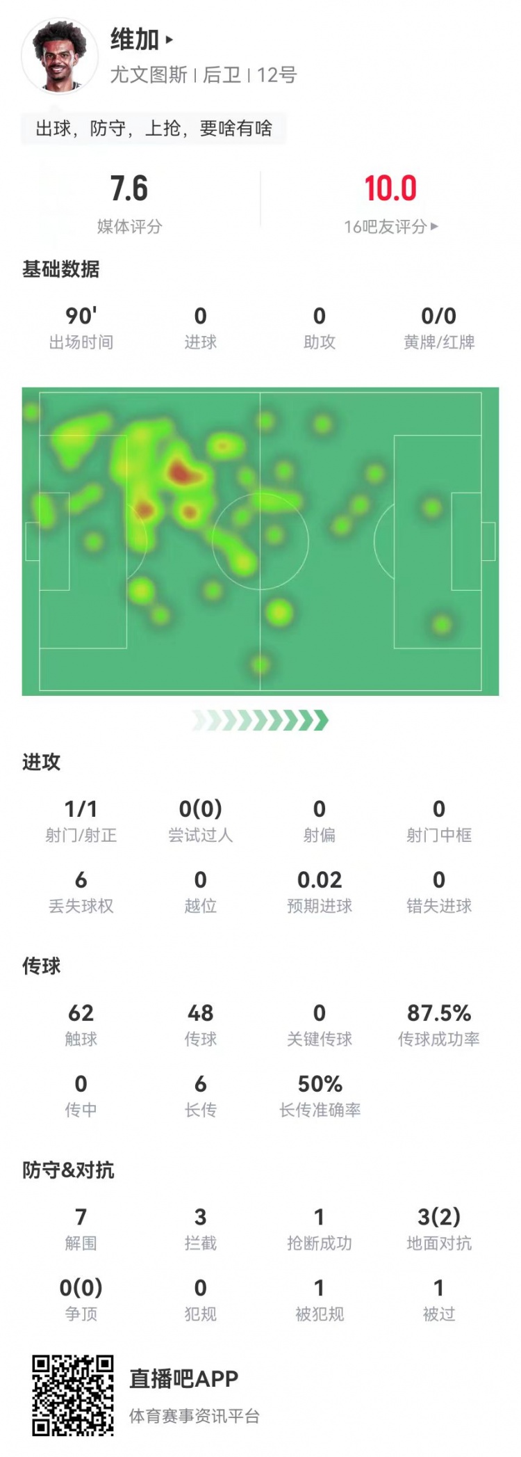 定海神针!维加本场0犯规7解围3拦截 6长传3成功 获7.6分全队最高