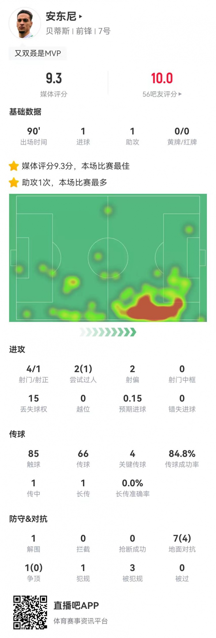 圆神闪耀!安东尼本场1球1助攻1造点 4关键传球3造犯规 9.3分最高