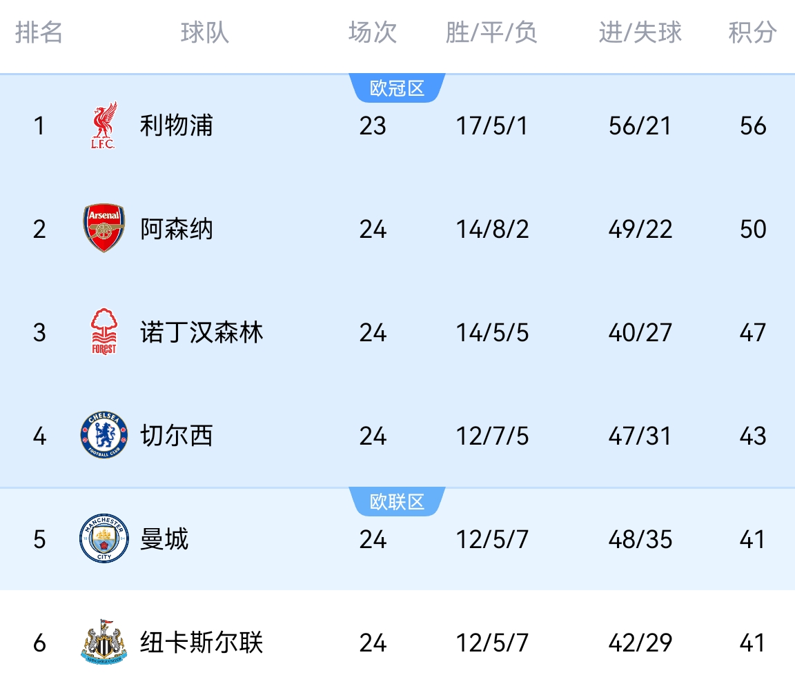 英超,24轮过后落后少赛一场的利物浦6分排名第二