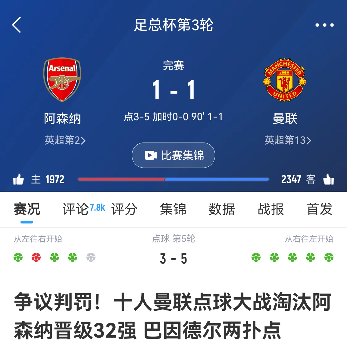 足总杯,1/32决赛点球3-5总分4-6不敌曼联