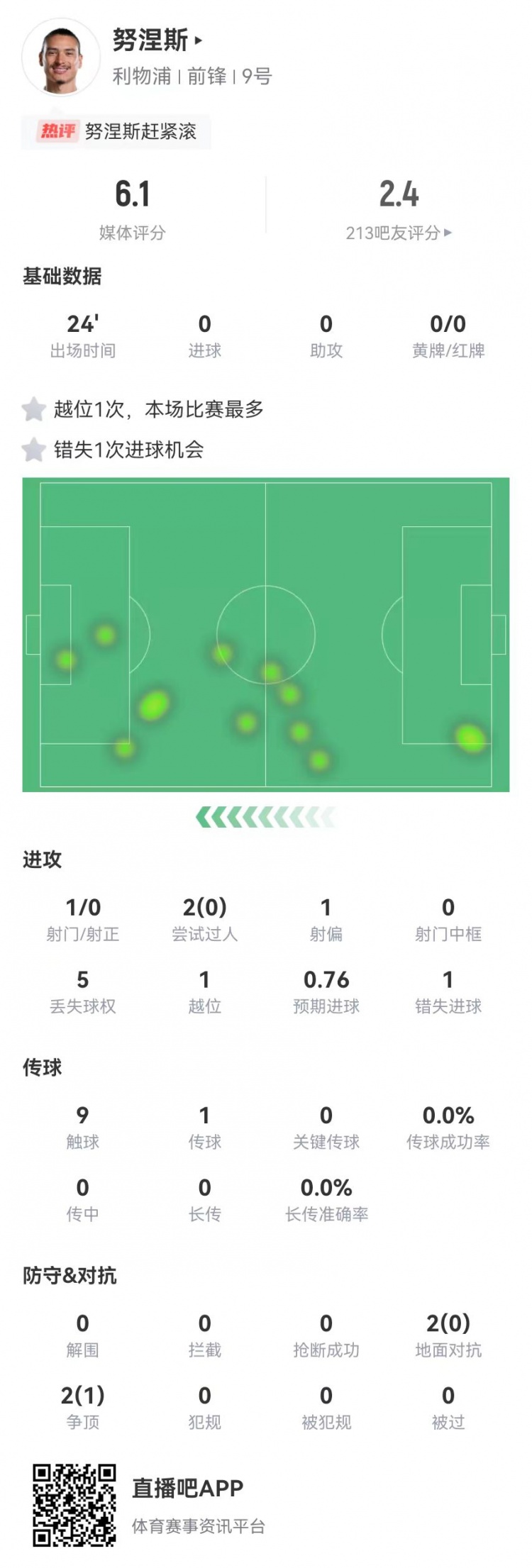 努涅斯本场替补1射门1失良机,4对抗1成功 获评6.1分全队最低