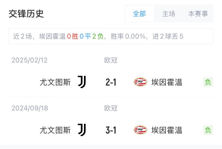 02月20日讯 在刚刚结束的欧冠淘汰赛附加赛中,尤文两回合总比分3-4不敌埃因霍温惨遭淘汰,巧合的是两队在之前的联赛阶段就有过交手,当时尤文曾3-1轻取对手,附加赛的首回合尤文也以2-1取胜抢占先机,但却在最关键的第二回合败北。