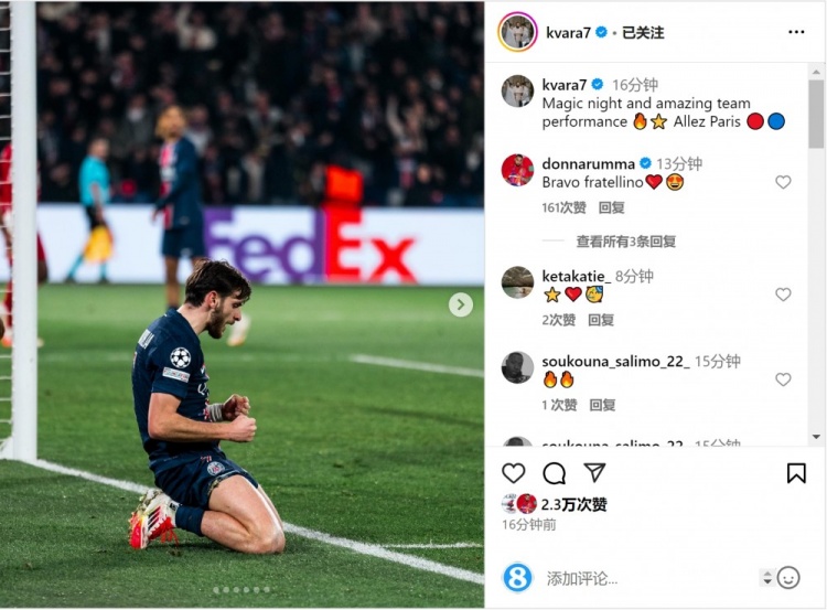 攻入加盟巴黎欧冠首球!K77社媒:神奇的夜晚,出色的团队表现
