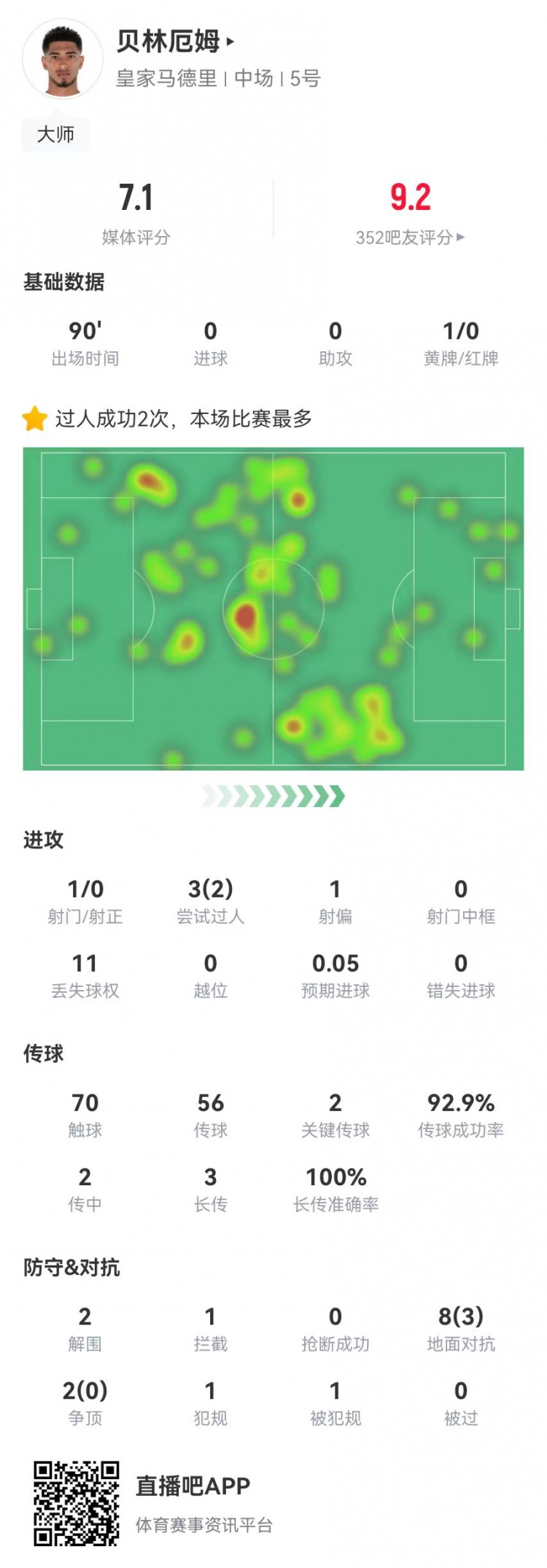 贝林厄姆本场2关键传球+3长传3成功 10对抗3成功 获评7.1分