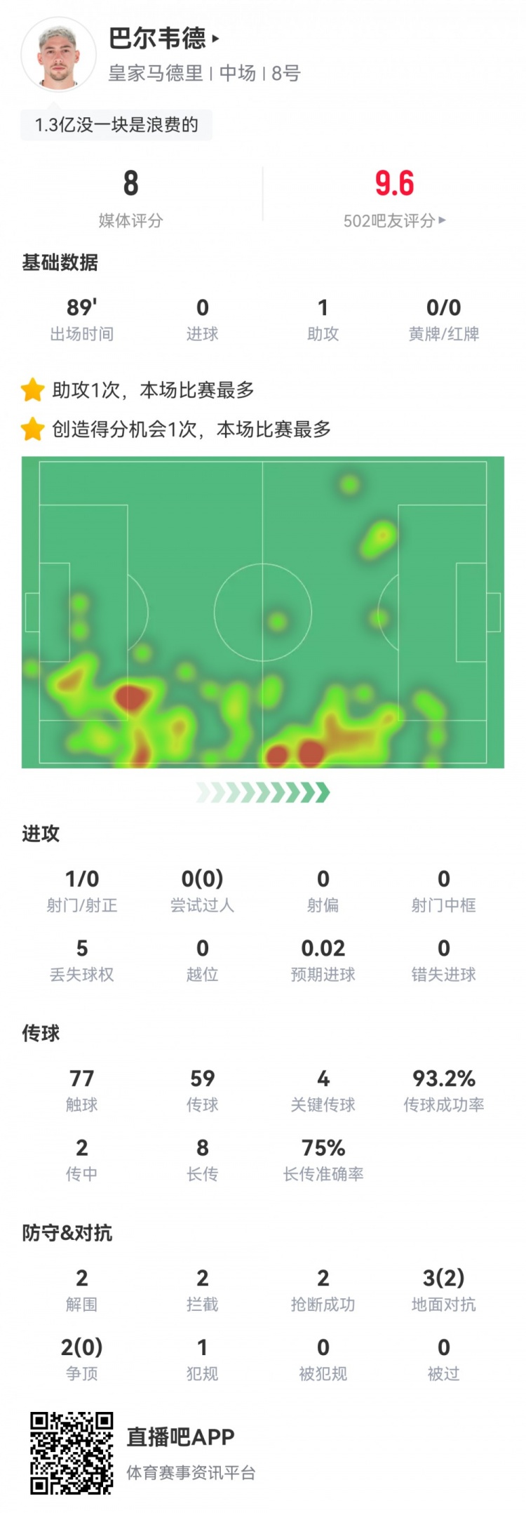 攻防俱佳!巴尔韦德数据:1助攻4关键传球6成功长传,评分8.0
