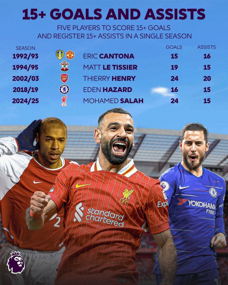 据统计,萨拉赫是英超历史上第5位单赛季进球和助攻次数都达到了至少15次的球员。
