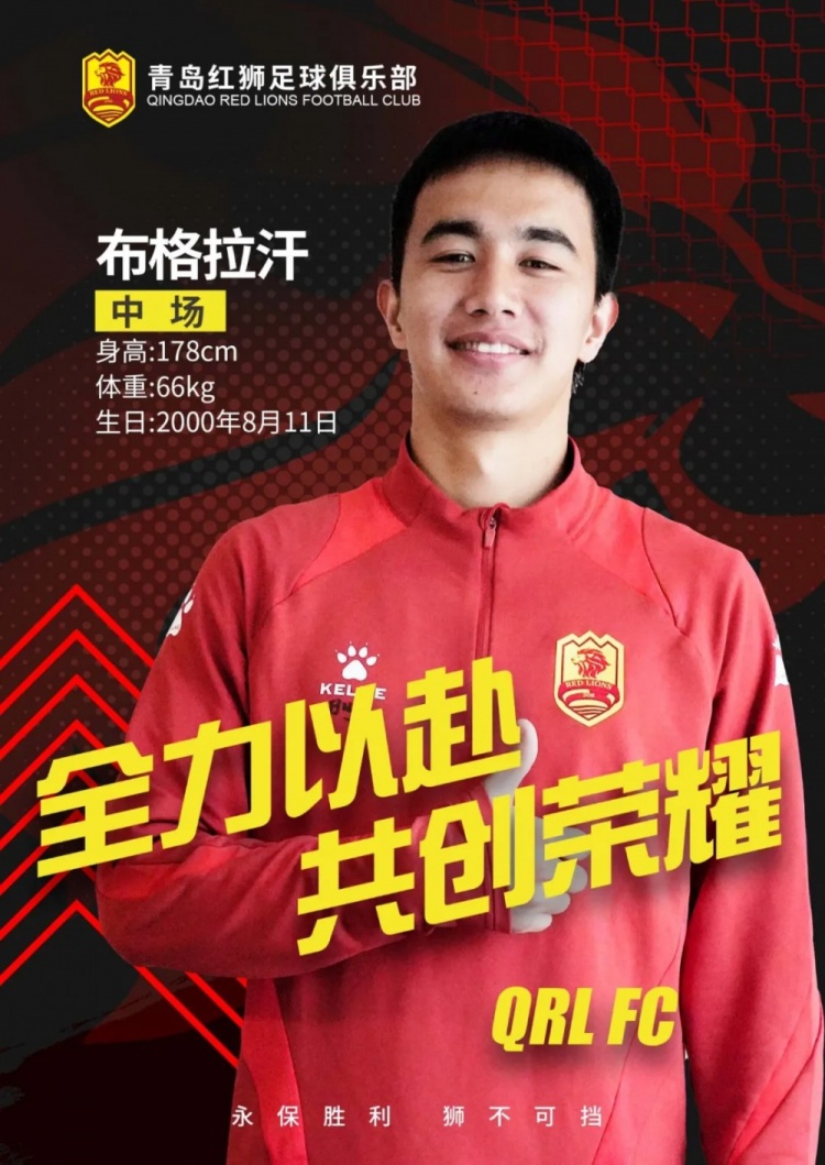 布格拉汗-斯坎旦尔,出生于2000年8月11日,身高178cm,体重66kg,场上司职前锋。这位来自新疆的小伙子早在2019赛季就随广州恒大淘宝夺得中超联赛冠军;2021-2022年作为沧州雄狮的球员,在中超联赛中同样表现出色;2023赛季转会回到广州队征战中甲联赛,出场25场,收获5粒进球和5次助攻。期待布格拉汗在青岛红狮能延续自己的精彩表现,为球队进攻线再添战力!