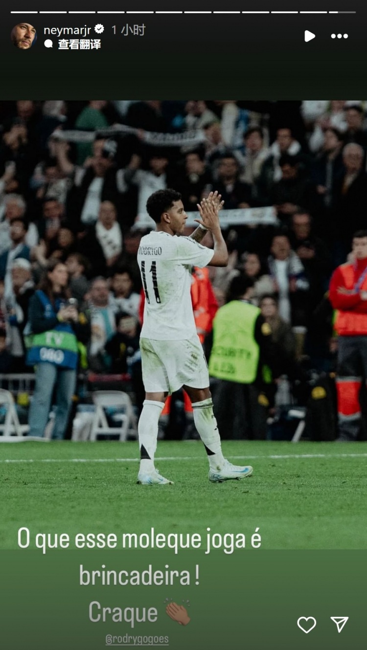 内马尔社媒晒罗德里戈照片:小伙子踢得太好了,王牌!