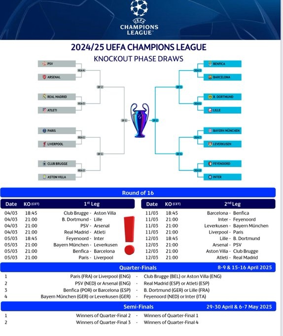 2月22日讯 24/25赛季欧冠淘汰赛赛程出炉,1/8决赛首回合将在3月5日凌晨开战。