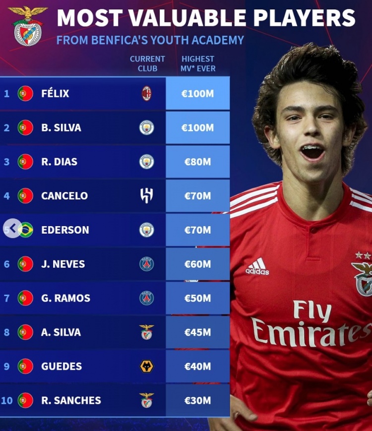 2月13日讯 《转会市场》统计了本菲卡青训历史身价最贵榜,菲利克斯和B席1亿欧并列居首。