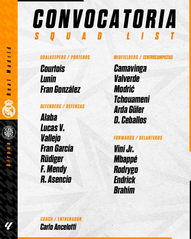 皇马对赫罗纳大名单:贝林停赛,姆巴佩维尼修斯领衔,阿拉巴在列