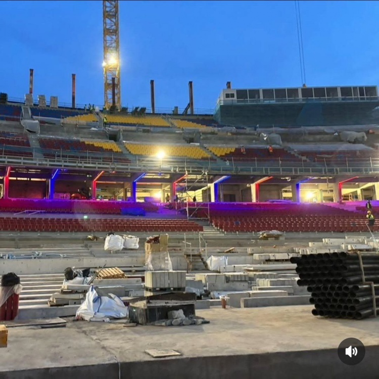 巴萨翻新诺坎普球场,相关工程正在进行中,博主晒出施工照片,确认诺坎普球场仍在测试第一层看台的照明系统。