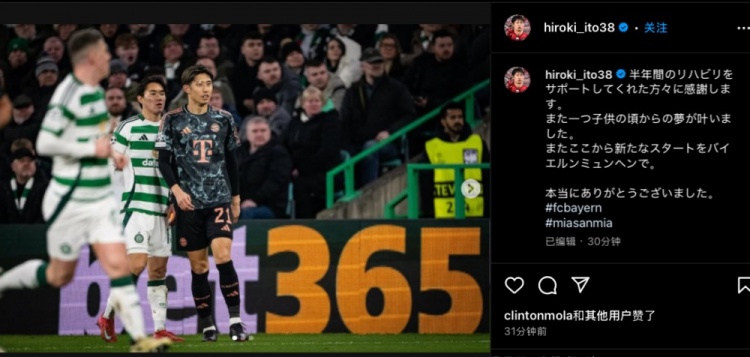 伊藤洋辉社媒纪念拜仁首秀:新的开始,感谢半年来帮助康复的各位