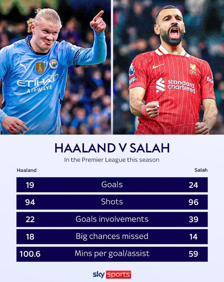 天空体育对比萨拉赫&哈兰德本赛季英超数据:前者效率明显占优
