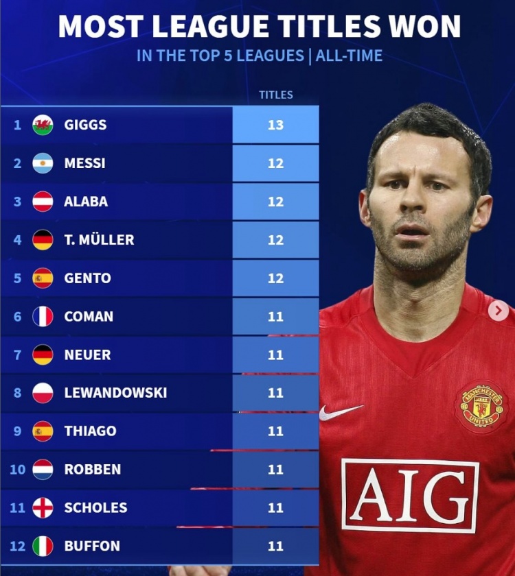 五大联赛历史夺冠榜:吉格斯13冠居首,梅西、阿拉巴、穆勒12冠